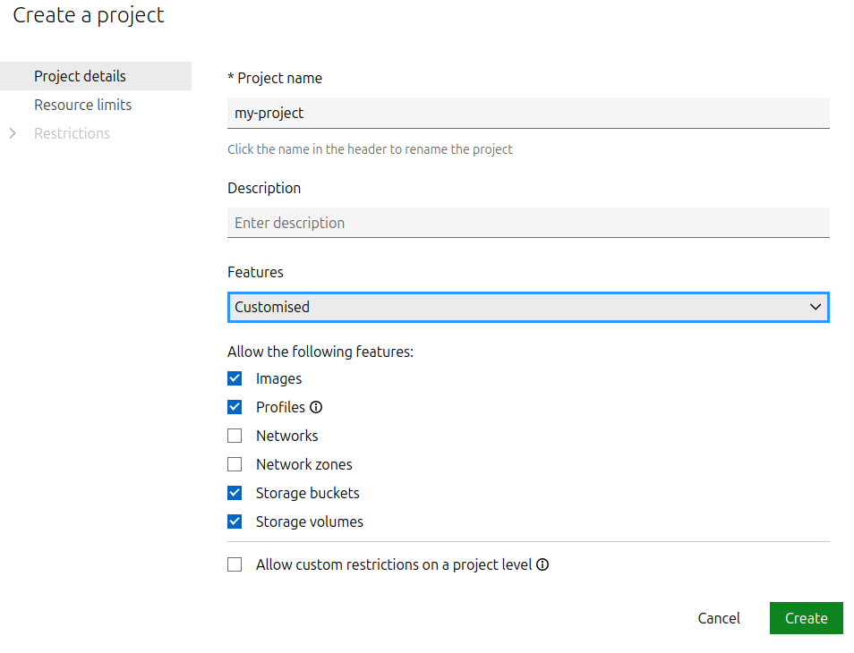 For example, to create a project called my-project that isolates instances, but allows access to the default project’s images and profiles, enter the following command: