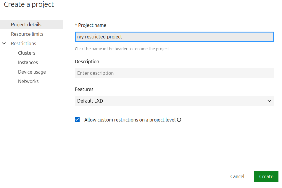 lxc project create my-restricted-project --config restricted=true --config restricted.snapshots=allow